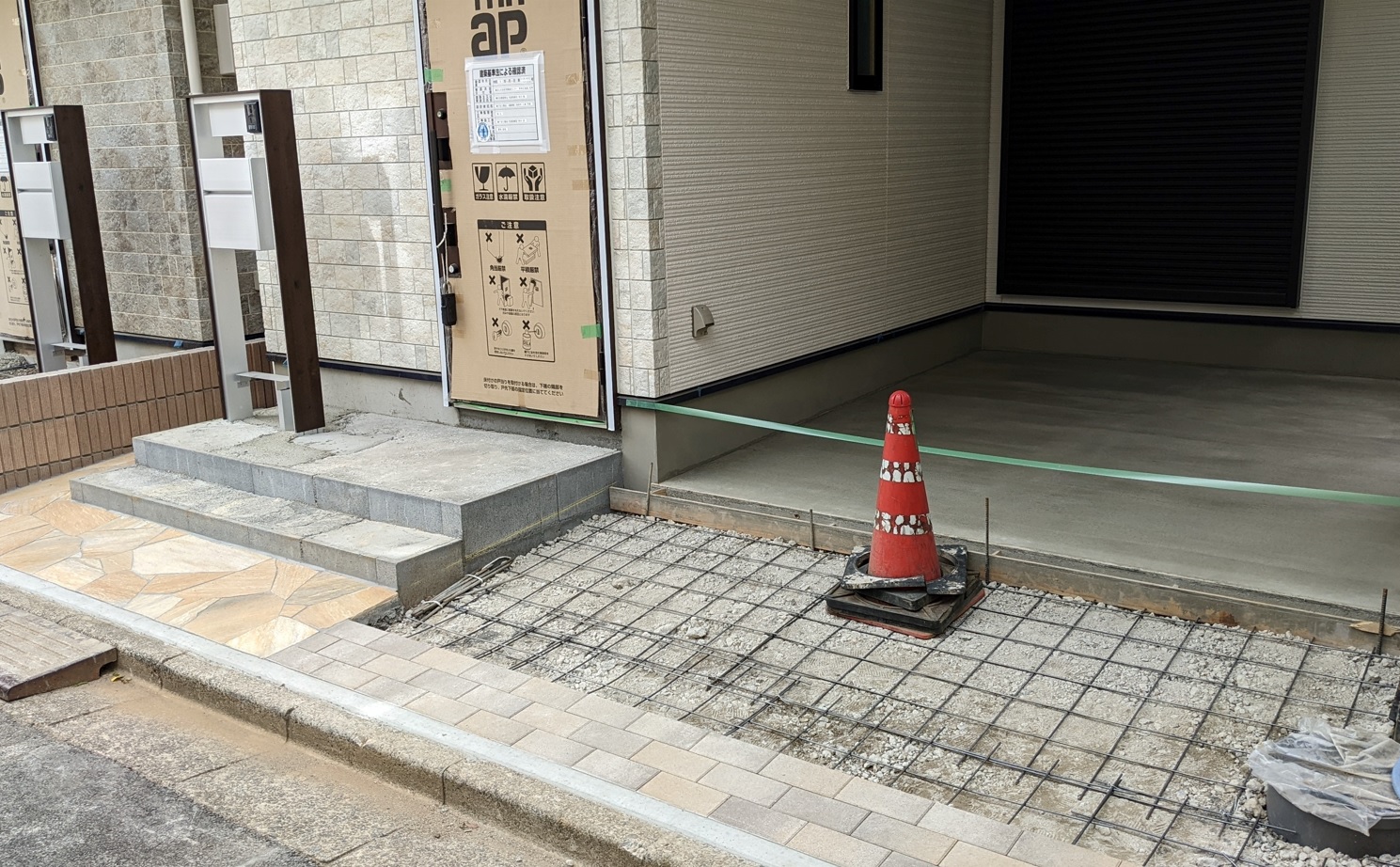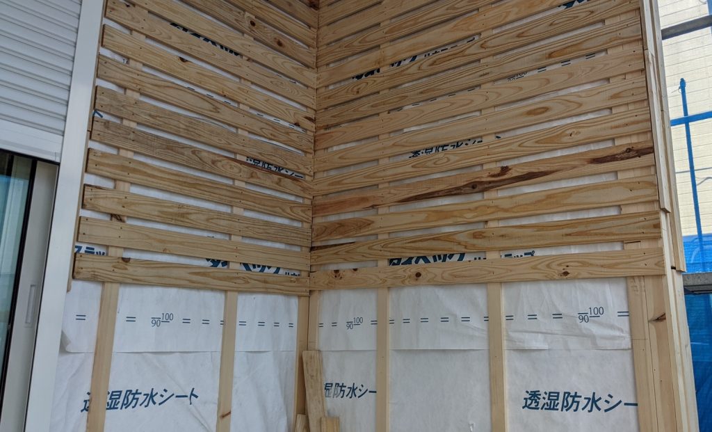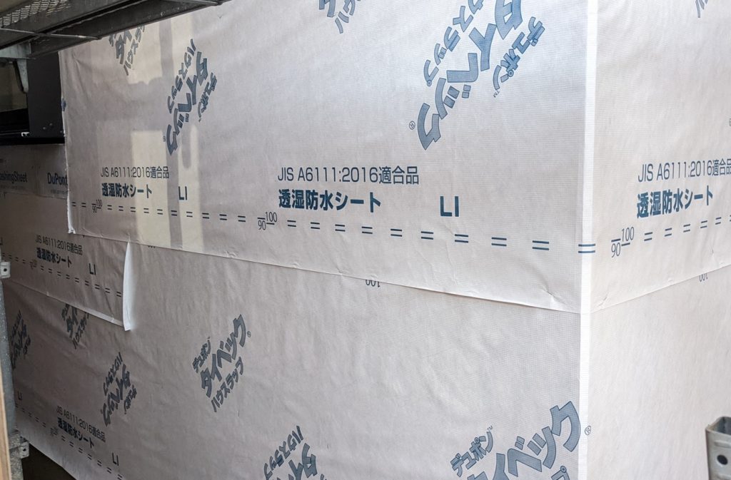 外壁材の上に左の写真のような透湿防水シートを貼り付けていきます。雨が浸透して木の躯体が痛まないようにする重要な工程です。